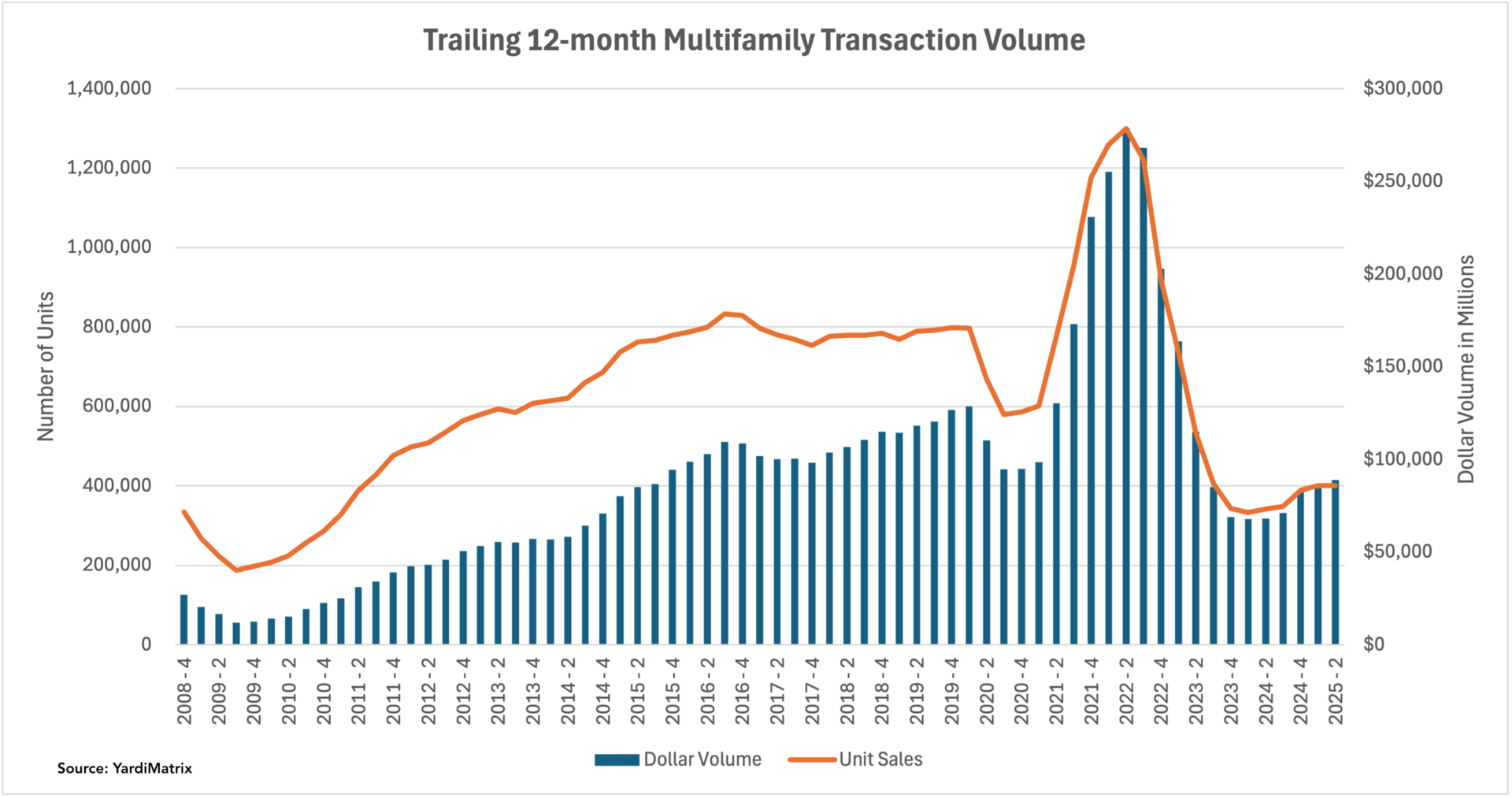 This chart shows transaction volume in both total dollars and units. This doesn’t capture valuations directly, but peaks in transaction activity line up closely with peak values. The same can be said for when transactions (and values) bottom out. Data from the first two quarters of 2025 suggests the beginning of an improving cycle for multifamily. Still, it’s fair to question whether this is a true national trend. Over the past 12-18 months, large portfolio trades from groups like Blackstone and KKR lifted the numbers, but broad-based buying hasn’t returned. And national economic uncertainty warrants caution.